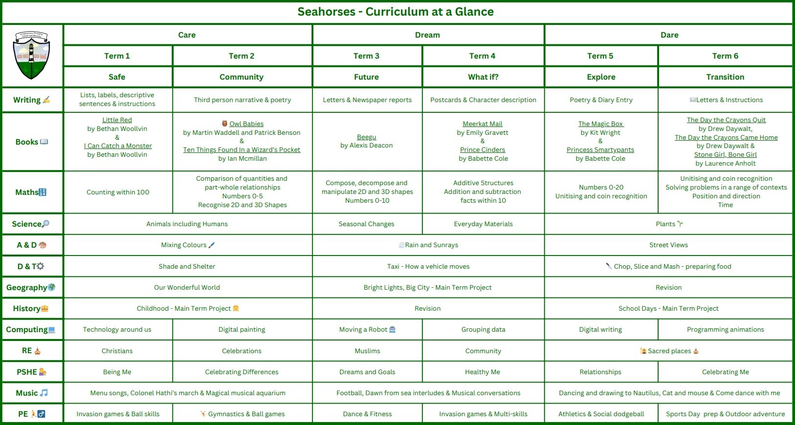 Seahorses Class Seahorses Autumn Newsletter Seahorses Spring Newsletter Seahorses Curriculum at a Glance Mastering Number at Greatstone Primary School PE Lesson Schedule for Term 3 Maths Resources