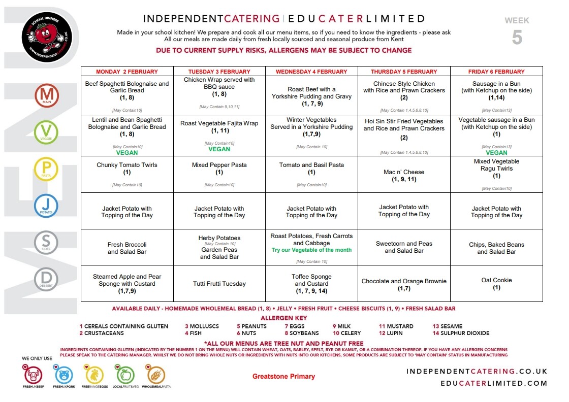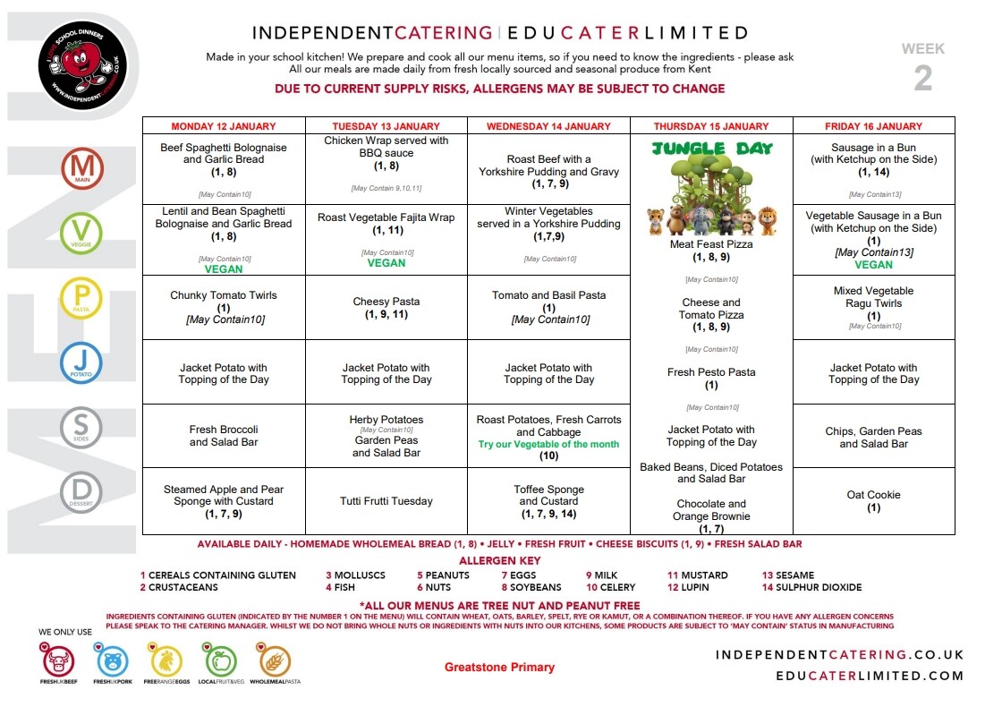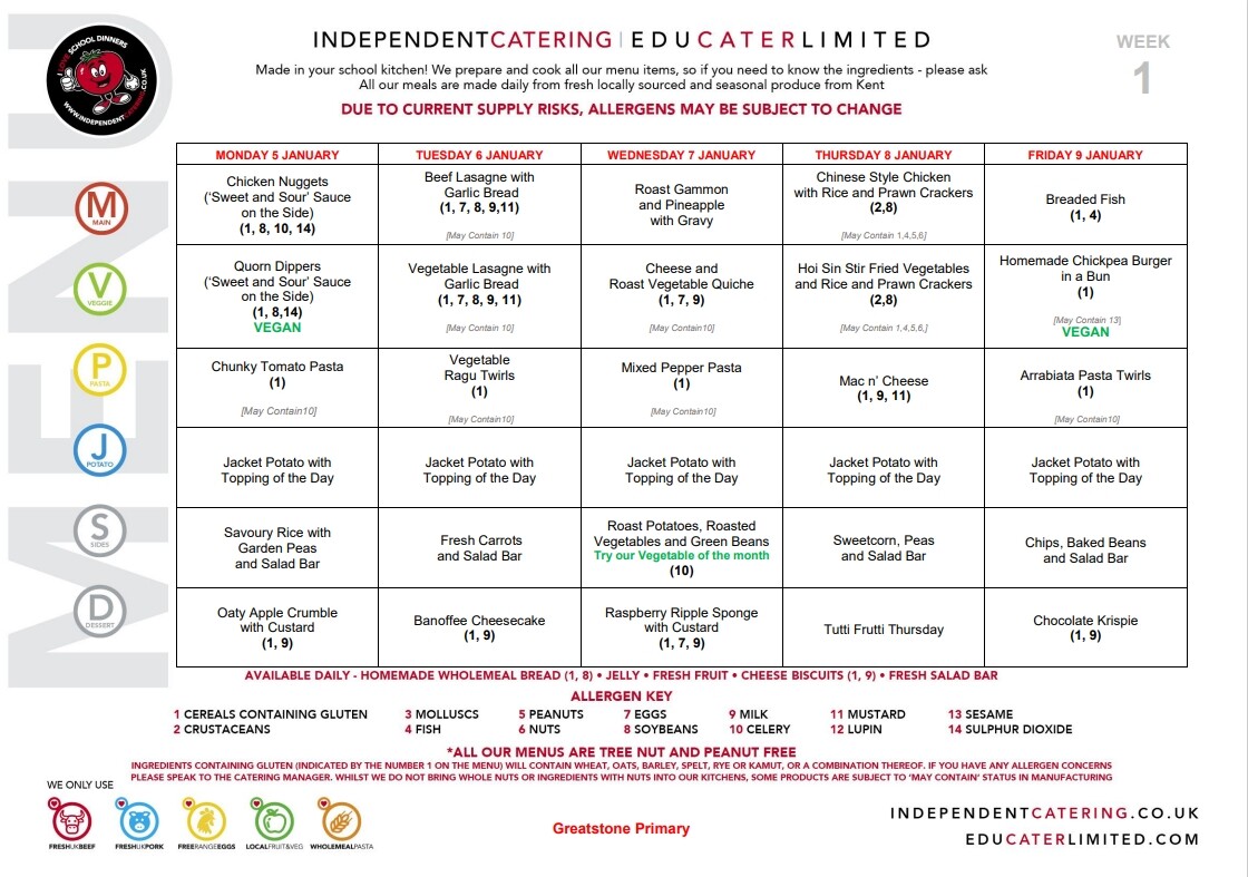 Independent catering offers freshly cooked meals daily.  Your child can choose from a main meal, vegetarian meal, pasta dish or jacket potato and children are able to help themselves to salad from the fresh salad bar every day.